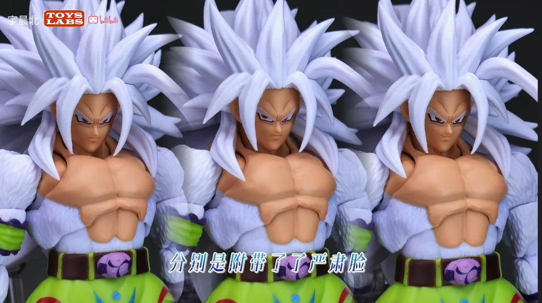 Unlike official releases, this figure specifically targets the “bulky” and “primal” aesthetic of the Super Saiyan 5 form, characterized by its silver-white fur and massive, flowing hair.
