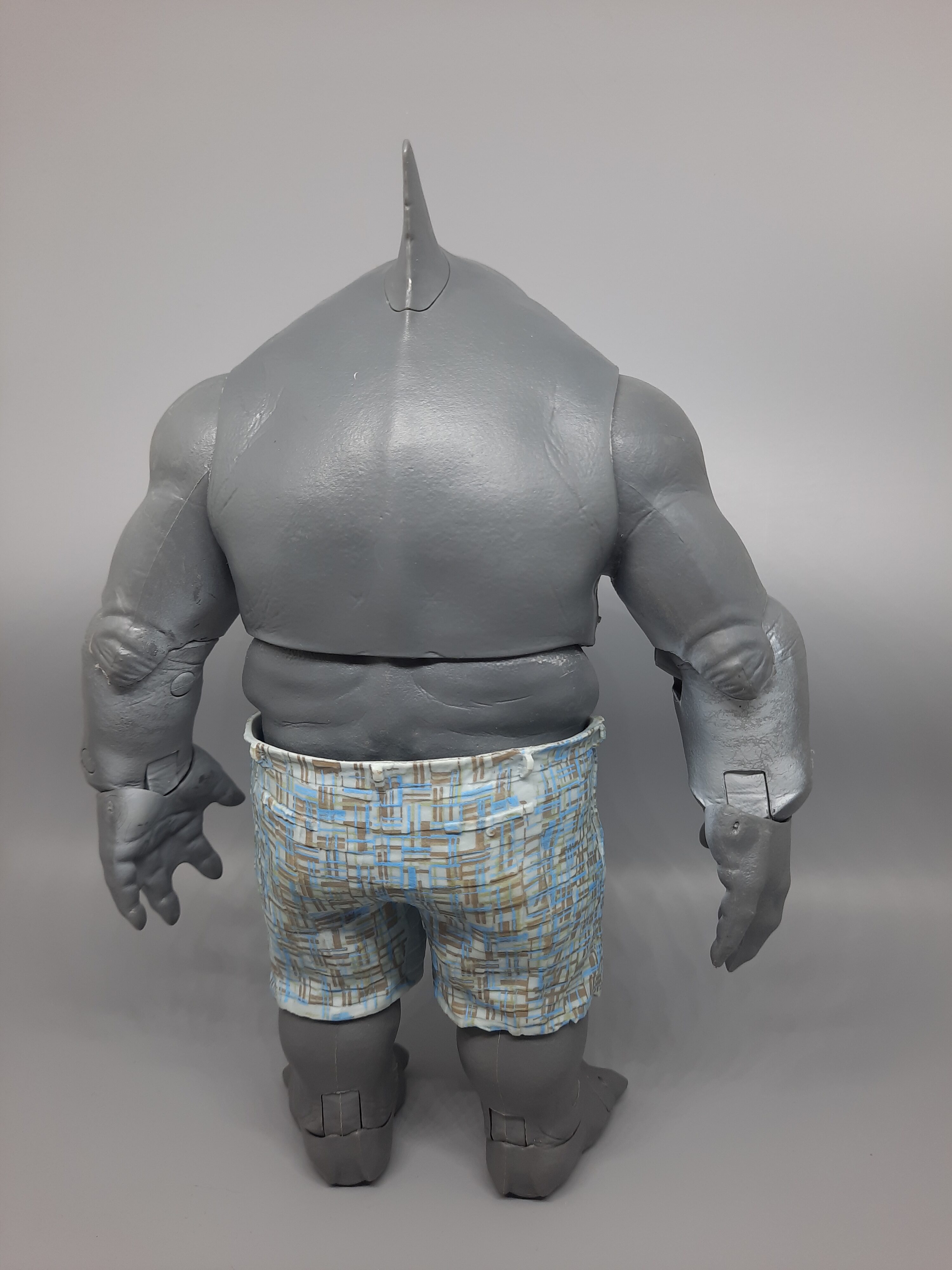 - Iconic Attire: King Shark is featured in his simple, white-and-black striped prison shorts, which are sculpted with folds and wrinkles to create a realistic look.